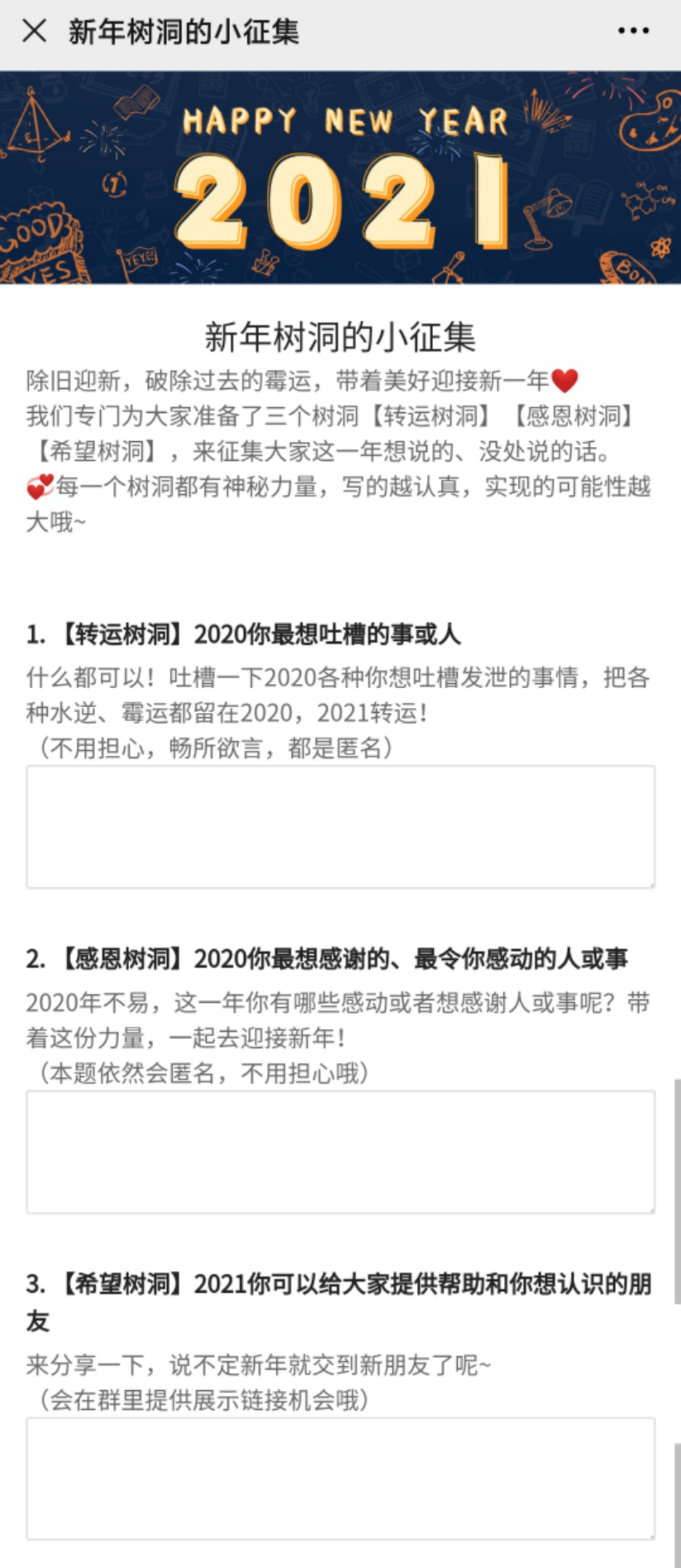 先開放樹洞,征集大家想說(shuō)的內(nèi)容,匿名提交。定下了3個(gè)主題,分別是:①2020你最想吐槽的;②2020你最想感謝感恩的;③新一年你想認(rèn)識(shí)結(jié)交的,以及你能提供給大家的。