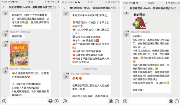 在新兵營,組長會(huì)帶著新的推廣進(jìn)行推廣,首先會(huì)宣傳活動(dòng),比如直推9.9元才獲得500鉆石,可以選擇3人拼團(tuán)拿2500個(gè)鉆石,新手還可以挑戰(zhàn)8單獎(jiǎng)勵(lì)《托馬斯繪本》,12單獎(jiǎng)勵(lì)其它實(shí)物,20單獎(jiǎng)勵(lì)更多實(shí)物。除此之外就是每天不時(shí)提供宣傳素材,包括文案、圖片和視頻。當(dāng)然老師也會(huì)自行采用紅包激勵(lì),一單1.88元紅包,并及時(shí)更新接龍名單等。