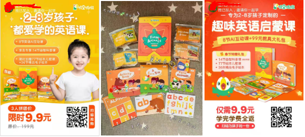 一般是9.9元的體驗(yàn)課不定期更新教材大禮包+采用完課返現(xiàn)制度+加贈(zèng)小課