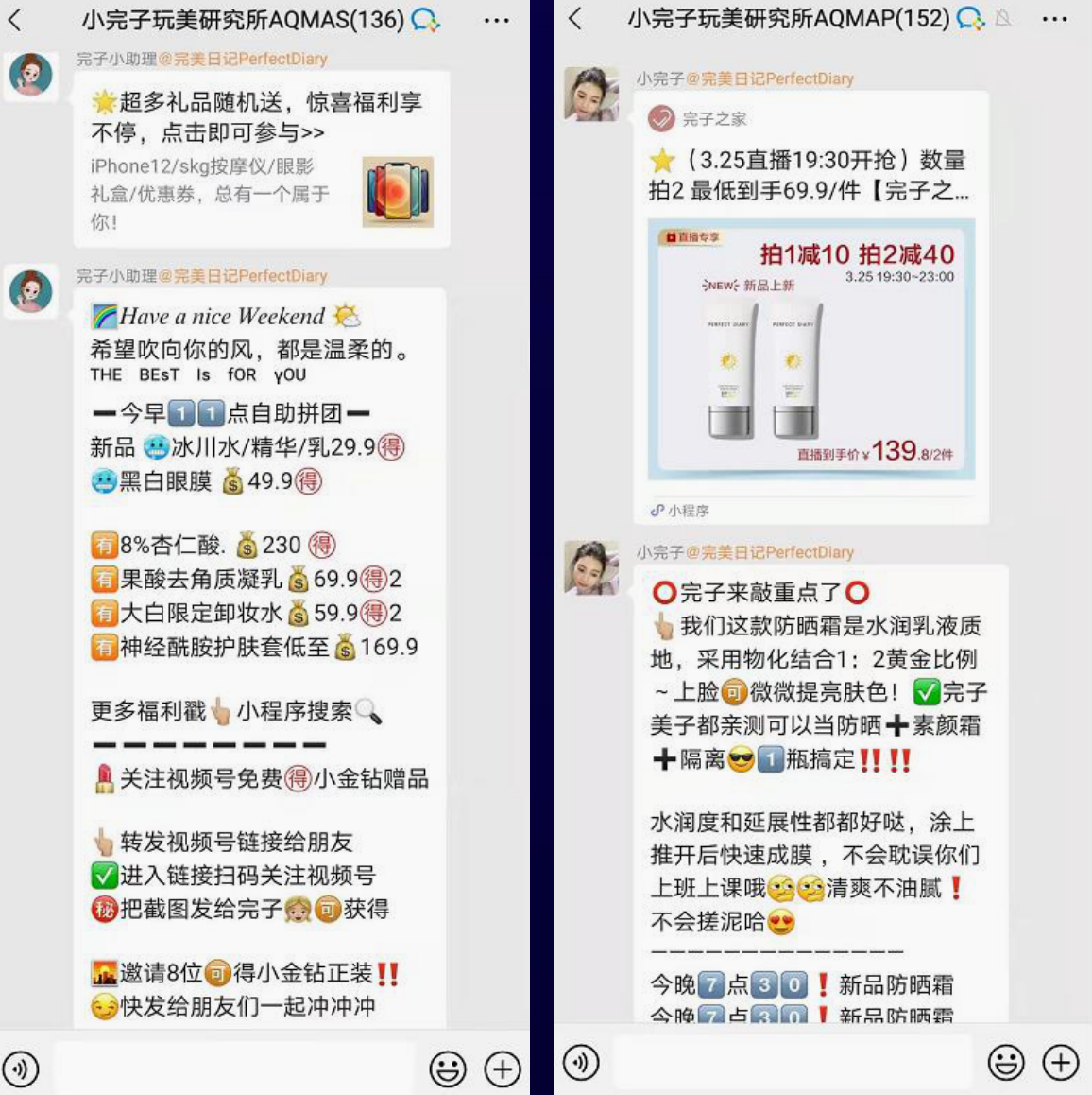 小完子完美研究所有很多干貨妝容分享,對(duì)于化妝小白來說是很剛需了,還會(huì)有新品發(fā)布,直播化妝和抽獎(jiǎng),持續(xù)不斷的活動(dòng)來吸引用戶的注意力,給到用戶不刪你不退群的理由。