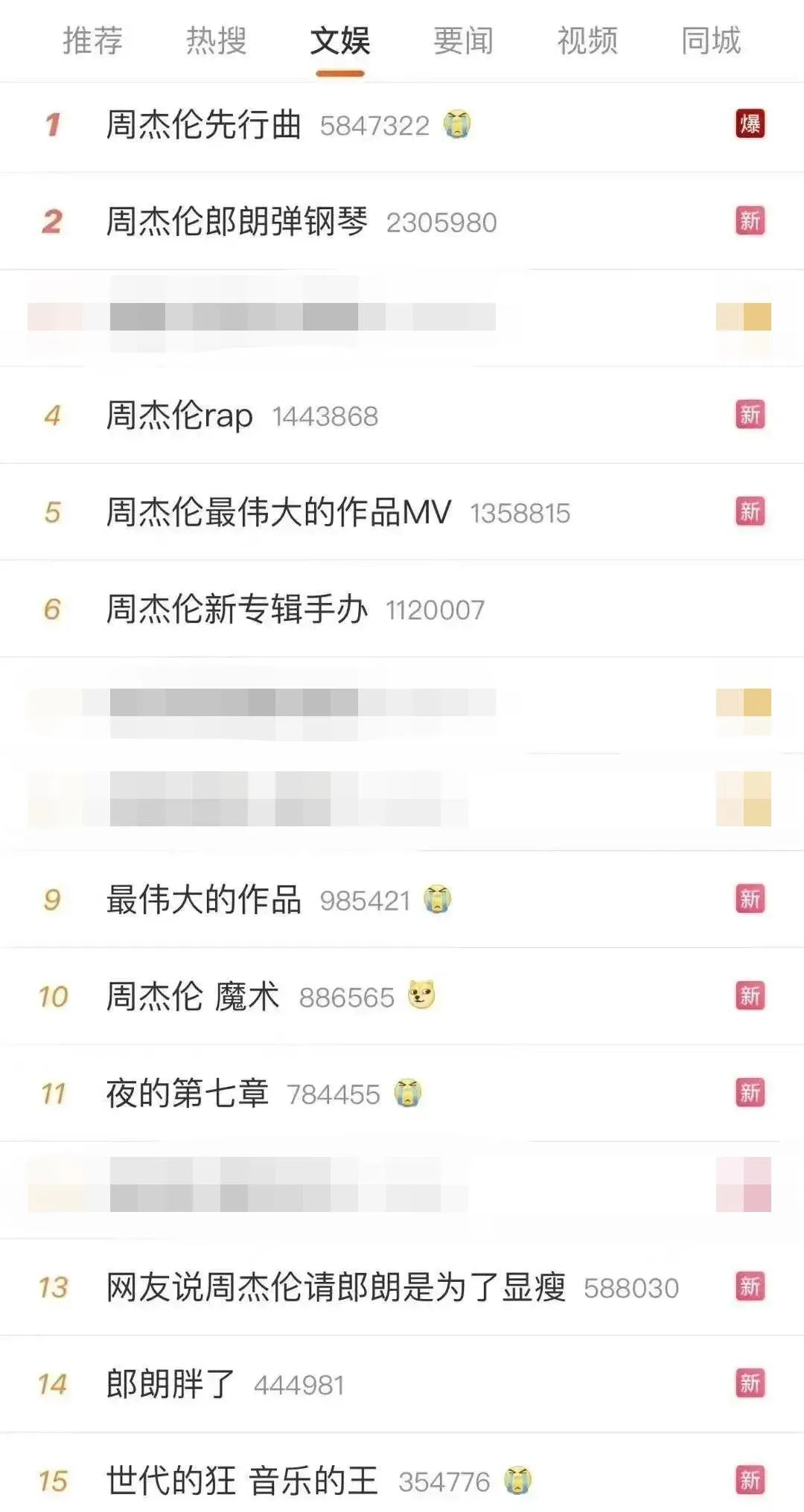 7月6日中午12點(diǎn),周杰倫暌違6年發(fā)布新專輯同名先行曲《最偉大的作品》,音源及MV甫一上線,便受到了大面積的關(guān)注和討論。除了#周杰倫先行曲#話題迅速爆火,登上熱搜榜單第一,周杰倫本人、MV中的畫面、專輯周邊、先前作品等內(nèi)容紛紛被網(wǎng)友擺上臺(tái)面,相關(guān)話題實(shí)時(shí)屠榜,幾乎包攬文娛熱搜榜前十五位。