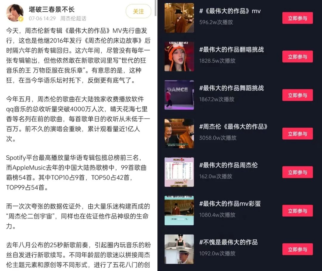 除了以上提及的三個(gè)獨(dú)家平臺(tái),微博和抖音作為用戶體量較大的平臺(tái),也同樣承擔(dān)了擴(kuò)大熱度的功能。在微博平臺(tái),除了熱搜榜單話題定制,引導(dǎo)用戶關(guān)注討論,不少有影響力的自媒體大V也會(huì)利用微博的文字傳達(dá)功能發(fā)布中長(zhǎng)篇圖文,在對(duì)周杰倫影響力的回顧和總結(jié)中引發(fā)大眾共鳴,提升用戶好感;在抖音平臺(tái),《最偉大的作品》相關(guān)“翻唱挑戰(zhàn)”、“舞蹈挑戰(zhàn)”、“變裝挑戰(zhàn)”層出不窮,抖音天然的bgm承載基因搭配與短視頻適應(yīng)度極高的多種類挑戰(zhàn),助推了歌曲的傳播發(fā)酵。