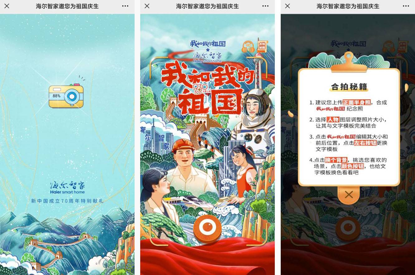 案例參考:這個由海爾智家推出的海報生成H5,通過邀請用戶合成自己和祖國的照片,來為祖國慶生,正是采用了走心型策略,用戶上傳照片后將自動進行人體摳圖,然后根據(jù)提示操作各種細節(jié)布置,包括調(diào)整背景,文字和每個文字的顏色,最后合成自己的照片和祖國的照片的合成海報。