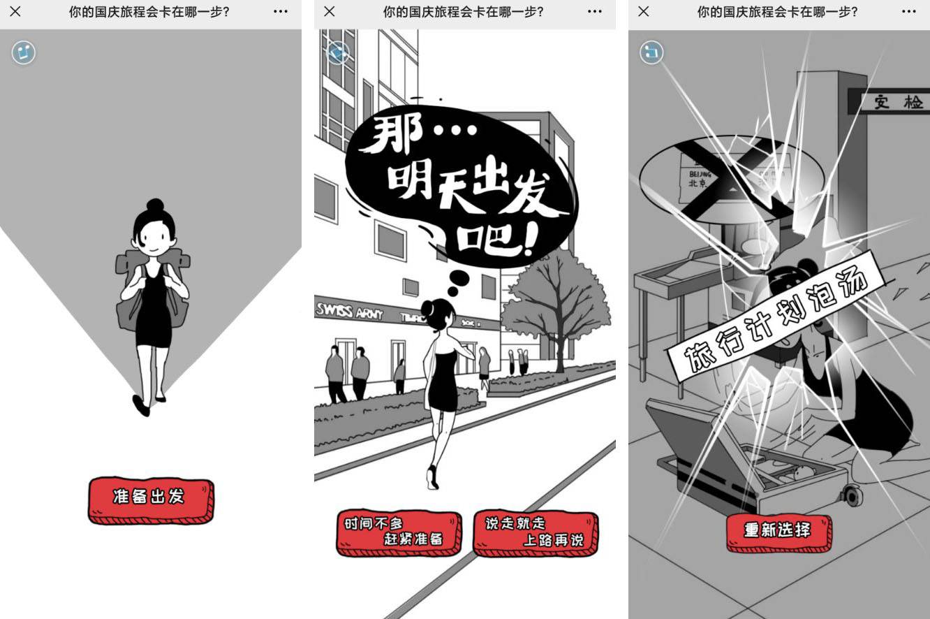 案例參考:這是由中國移動無憂行推出的國慶節(jié)宣傳活動,結(jié)合當下的疫情環(huán)境,邀請用戶在國慶旅行之前,模擬用戶出行會遇到的問題,比如出發(fā)簽到準備,疫情報備、安全防護等問題,融入疫情外出防護知識,通過趣味性與教育性相結(jié)合來吸引用戶參與和分享活動。