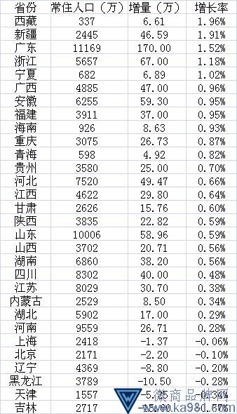 從常住人口的增長率來看,前10名的省份中,除了西藏、新疆和寧夏這三個西部省份位居前列外,其他省份均來自南方。其中廣東和浙江超過了1%,廣西、安徽、福建和海南也都超過了0.9%。9oS