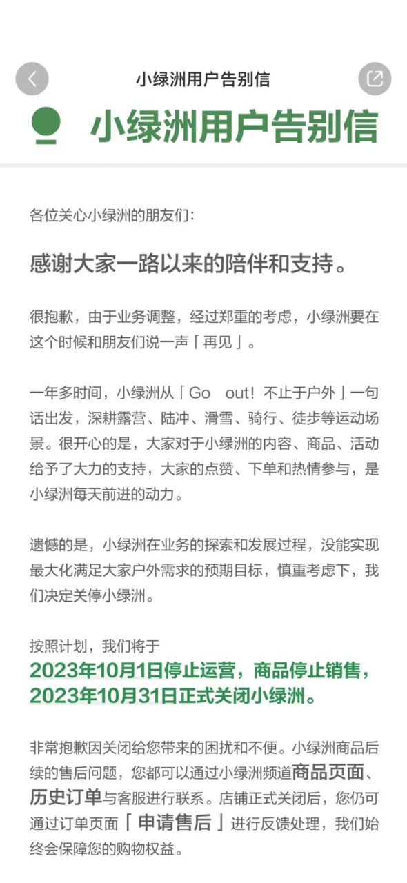 通過公告我們得知是業(yè)務(wù)調(diào)整,在小綠洲的探索過程中也未能最大化滿足用戶的戶外需求,綜上決定于10月1日停止運(yùn)營(yíng)。