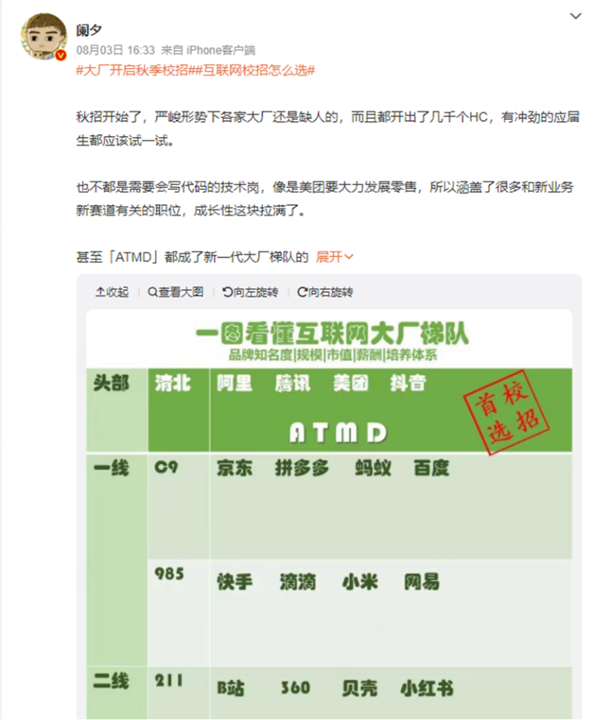 網(wǎng)友用大學(xué)的實(shí)力,來比照互聯(lián)網(wǎng)大廠排名。比如將第一梯隊(duì)的ATMD即阿里、騰訊、美團(tuán)、抖音比喻為清北;將京東、拼多多、螞蟻、百度比喻為C9;快手、滴滴、小米、網(wǎng)易為985等。