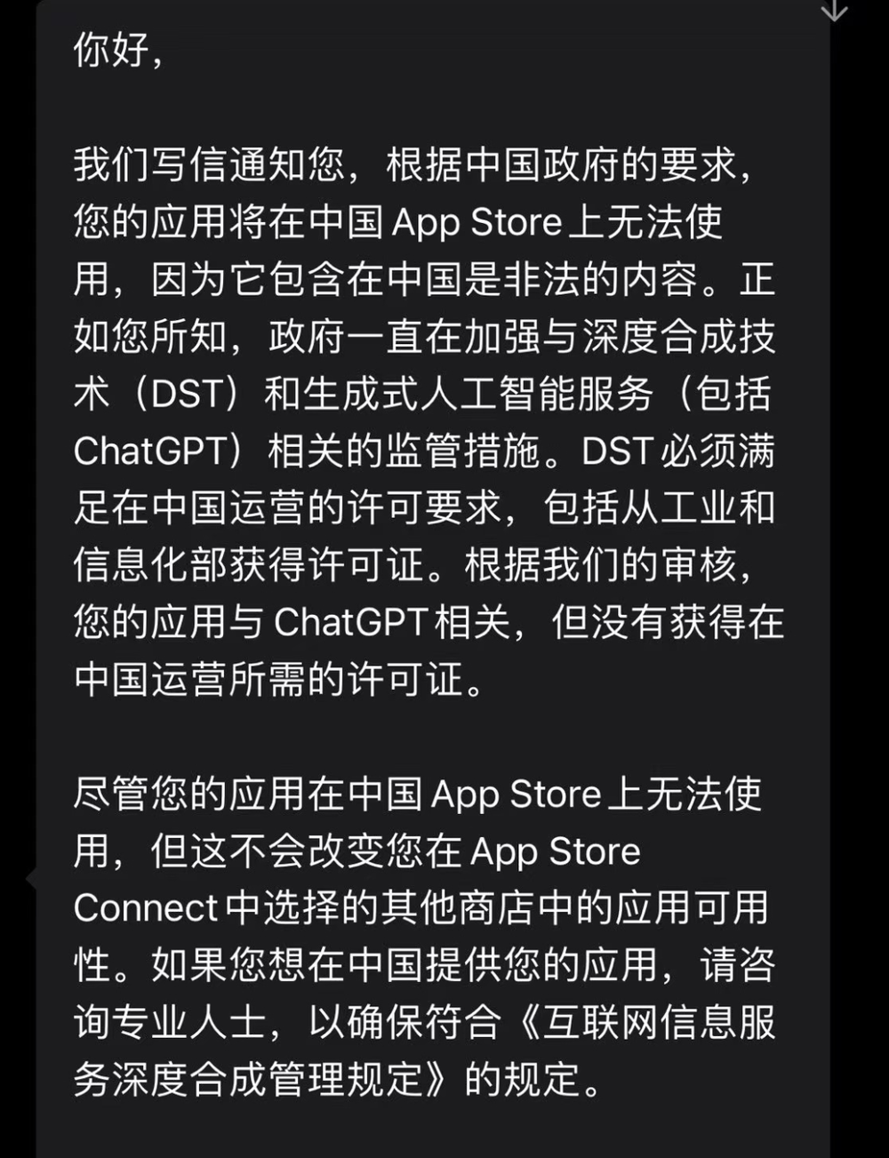 很快,蘋果商店通過(guò)在中國(guó)區(qū)下架了大量生成式人工智能應(yīng)用對(duì)這一新規(guī)定做出了回應(yīng),在面向開(kāi)發(fā)者給出的回復(fù)中,蘋果官方給出的審核建議是“生成式人工智能服務(wù)必須滿足在中國(guó)運(yùn)營(yíng)的許可要求,包括從工信部獲得許可證”,這代表著從監(jiān)管部門到平臺(tái)方都對(duì)AIGC市場(chǎng)釋放出了促進(jìn)合規(guī)的明顯信號(hào)。
