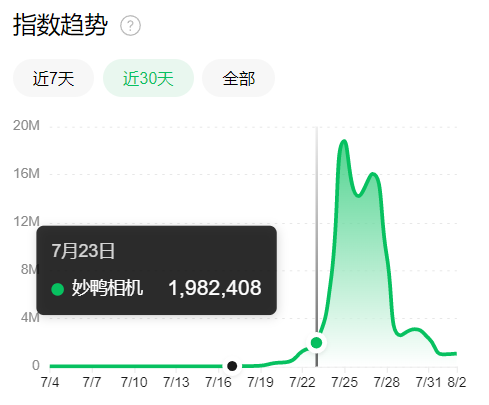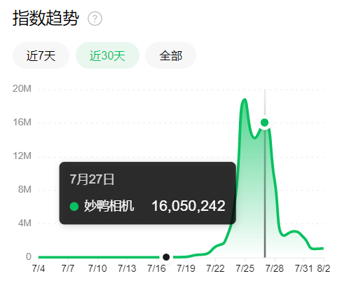 不過(guò)即使有這五點(diǎn)優(yōu)勢(shì)的加持,妙鴨相機(jī)在迅速走紅之后也出現(xiàn)了快速退熱。同樣從微信指數(shù)的來(lái)看,在經(jīng)歷7月25日、27日的兩個(gè)峰值后,妙鴨相機(jī)在微信平臺(tái)的熱度開(kāi)始快速下滑。