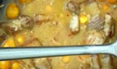 (3)然后倒入剁好的雞塊,開大火,將雞塊抄到顏色變成金黃色時就可以加入鳳眼果了,之后再進行翻炒一會,然后放入2碗水,水燒開后,轉(zhuǎn)中火再煮20分鐘,這道菜就可以出鍋了。