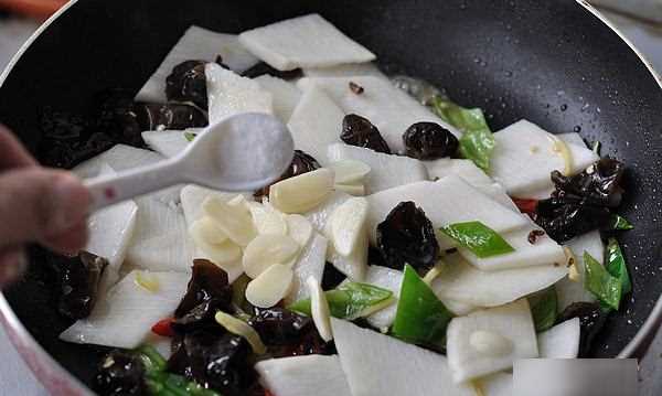 8、倒入青椒片、木耳翻炒。