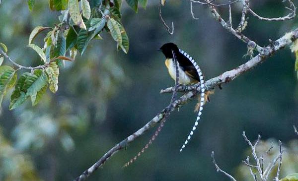 極樂鳥是出了名的高顏值家族,它又是該家族中非常奇特、美得最有個(gè)性的一員。雖體長(zhǎng)只有22cm,但頭上兩根天線般的飾羽卻長(zhǎng)達(dá)50cm。當(dāng)它一邊鳴唱一邊舞動(dòng)羽冠,就仿佛頭戴雉雞翎的京劇演員正在表演,虎虎生威,飄逸瀟灑。