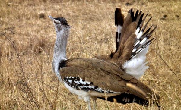 灰頸鷺鴇:別名柯利鳥_南非大鴇,為鶴形目、鴇科、鷺鴇屬鳥類,原產(chǎn)于非洲南部及東部部分地區(qū)。野生于平坦、開闊、干燥的大草原和灌木叢林。1822年命名,共2個(gè)亞種。鳴叫時(shí),先將空氣吸入食囊中,使脖子鼓脹成平常的四倍,呼出空氣后,發(fā)出一串有六個(gè)音符的叫聲,每個(gè)音符間隔半秒鐘,并以抖動(dòng)新鈔票似的清脆響聲結(jié)尾。這是一種低沉而有回響的交配鳴叫。30秒鐘后,會(huì)再次吸入空氣,發(fā)出叫聲。在非洲,人為捕殺是灰頸鷺鴇生存的最大威脅。