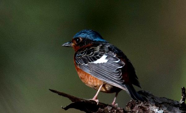 頭體長17-19cm,兩性異色。雄鳥藍色限于頭頂、頸背及肩部的閃斑。頭側(cè)黑,下體多橙栗色。與其他磯鶇的區(qū)別在喉塊白色,除藍頭磯鶇外與所有其他磯鶇的區(qū)別在于白色翼紋。與虎斑地鶇的區(qū)別在體型較小,喉白,眼先色淺,耳羽近黑。虹膜褐色、嘴近黑、腳黯橘黃。翅黑,而腹栗,各色相襯顯著。幼鳥上體自額至尾上復羽均暗褐或黑褐色,而雜以棕色,頭頂成點斑狀,背部則形成橫斑。